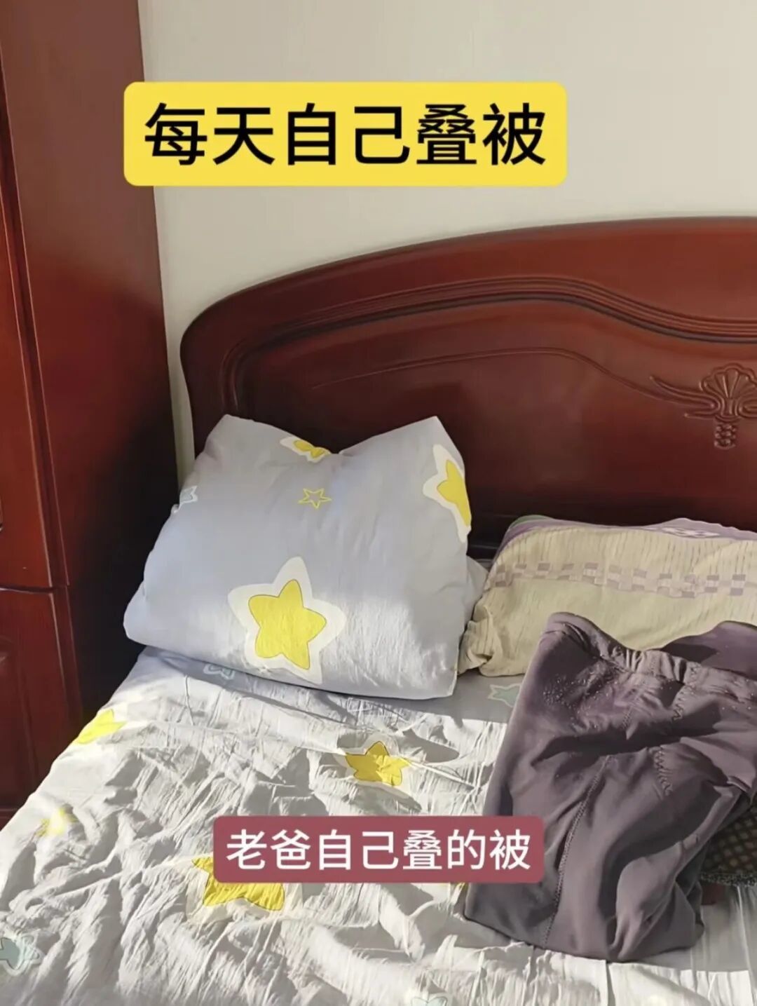 但有一件事,他从来没搞错过。每天早上5:50准时起床。被子叠成豆腐块,床单抻得一丝褶皱都没有。女儿想帮忙,他不让:“我自己来!”