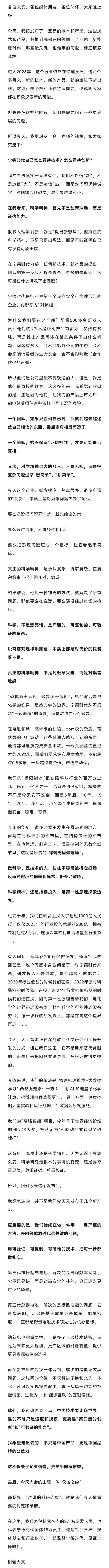 宁德时代董事长、CEO曾毓群也在会上进行了演讲,他表示进入2026年后,行业快速发展,这两个月新技术、新产品、新表达不断出现,大家都在积极探索新的可能。