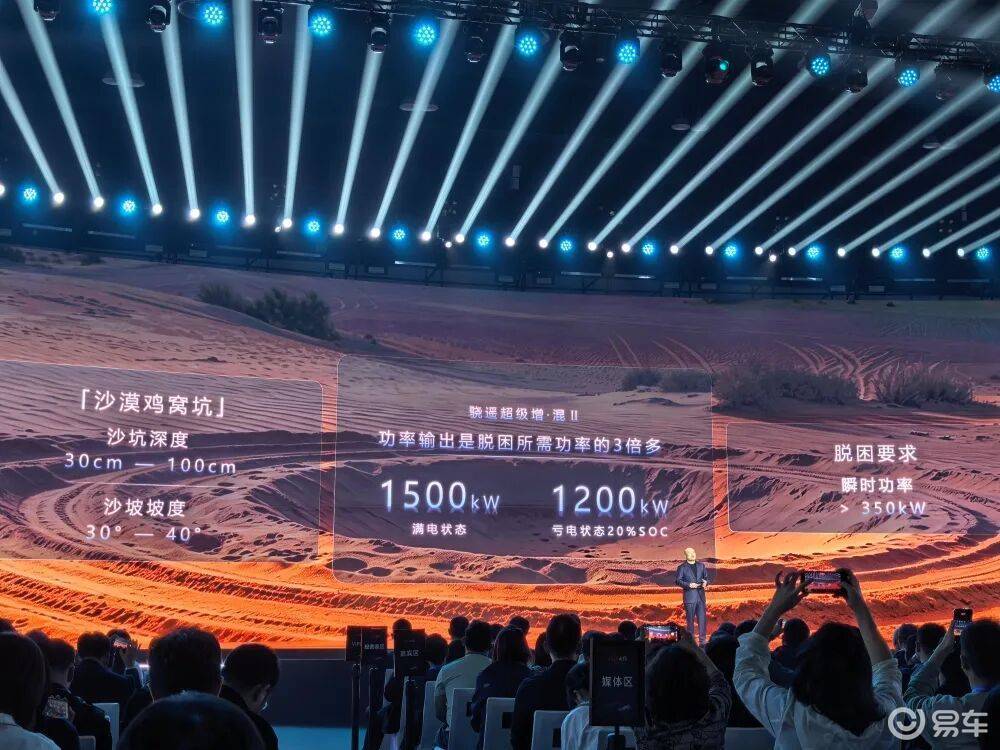 动力方面,第二代骁遥满电状态下瞬时功率达1500kW,20%SOC亏电下仍可稳定输出1200kW,以硬派越野典型场景为例,沙漠“鸡窝坑”脱困需电池提供超过350kW瞬时功率,而骁遥电池的输出功率是脱困所需的3倍以上。