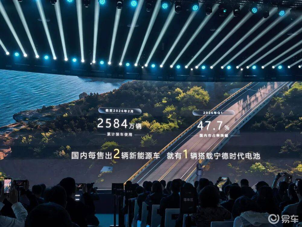 宁德时代首席技术官高焕则介绍了宁德时代过去的成绩,截至2026年2月,宁德时代电池累计装车使用达2584万辆,2026年第一季度国内市占率突破47.7%,高焕表示国内每售出2辆新能源车,就有1辆搭载宁德时代电池。