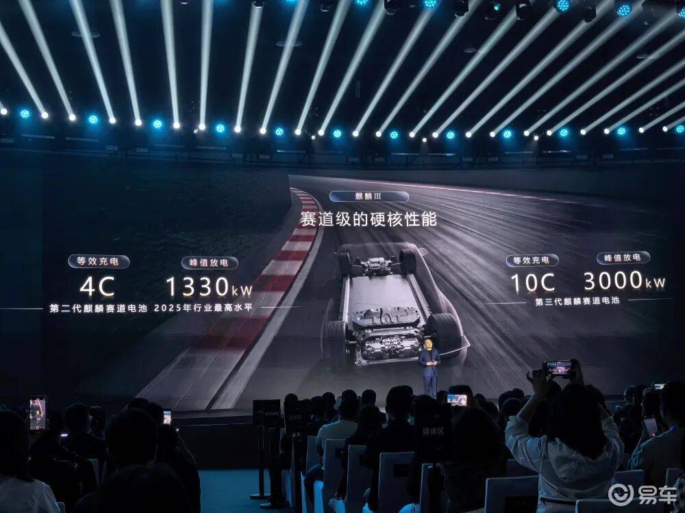 此外还有第三代麒麟赛道电池,同样带来了10C等效充电速度,峰值放电功率可达3000kW,是上一代的两倍还多。