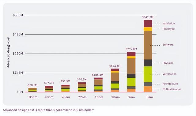 可以看到,28nm时,还只要2850万美元,但到了28nm时,就要5130万美元了,到了10nm时,涨至1.744亿美元,到5nm时,就高达5.422亿美元了。