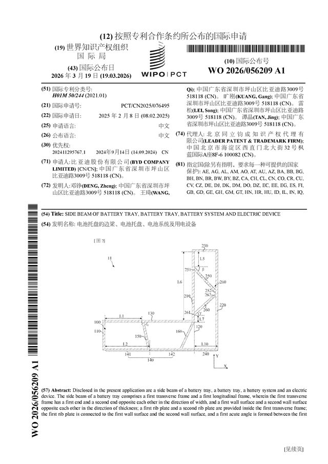 证券之星消息,根据企查查数据显示比亚迪(002594)公布了一项国际专利申请,专利名为“电池托盘的边梁、电池托盘、电池系统及用电设备”,专利申请号为PCT/CN2025/076495,国际公布日为2026年3月19日。